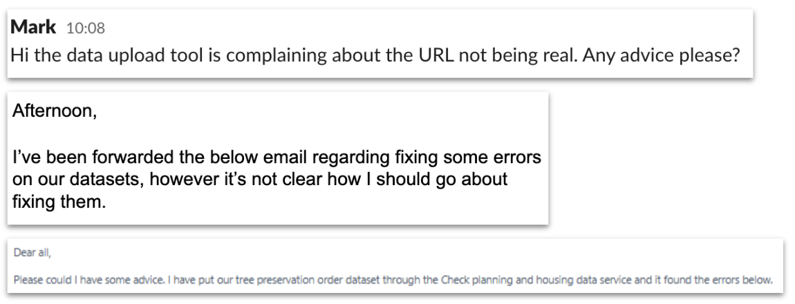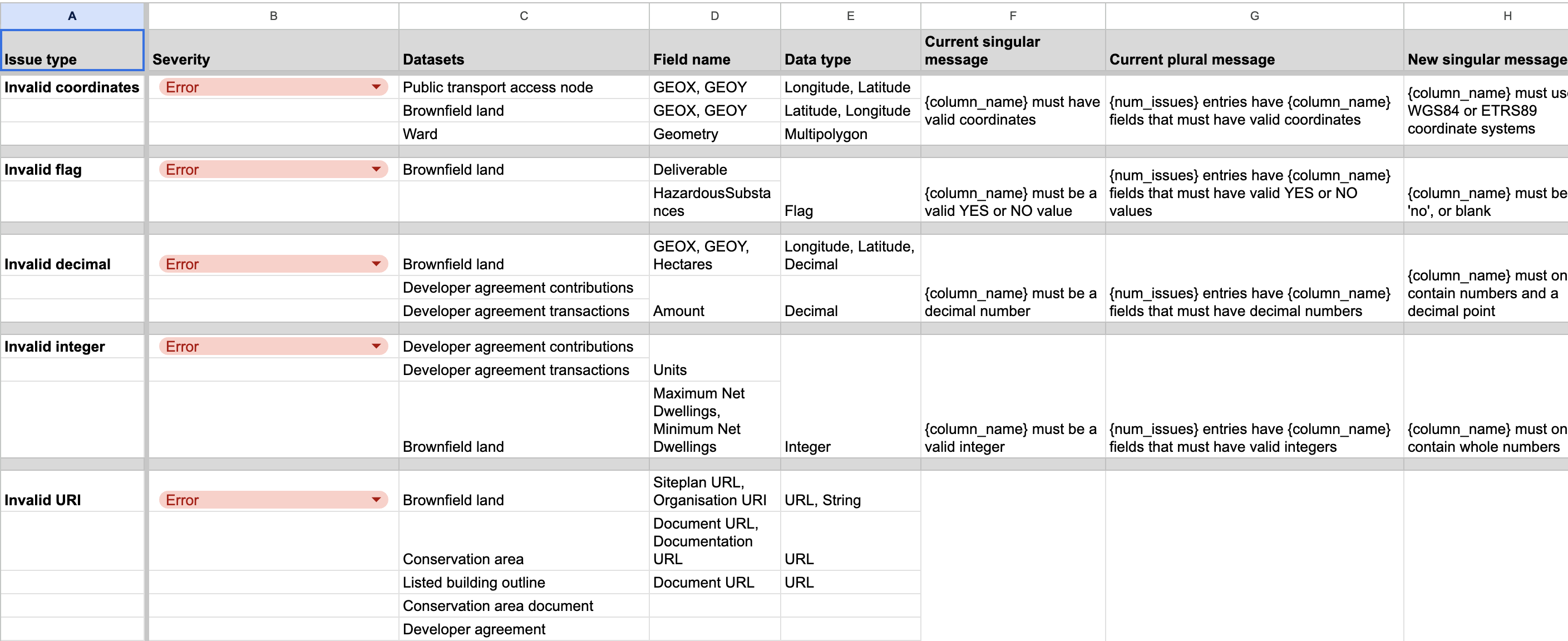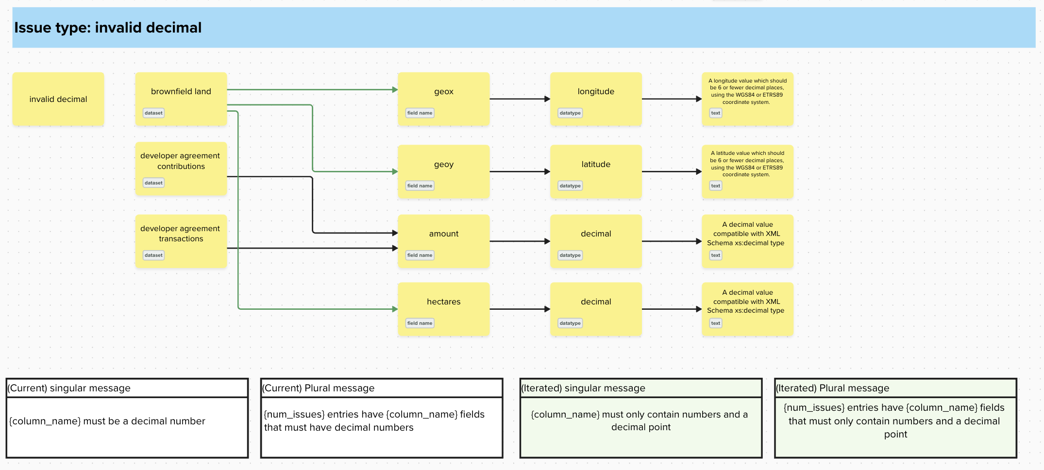 Feedback and insights from user research has highlighted that issue messages were not always clear to users and did not point them towards the action required to address data quality issues. We also know this from emails we receive and messages from LPAs in the #group-data-support Slack channel. For example the use of ‘{column_name} must have valid coordinates’ and ‘{column_name} must be above the minimum number needed’. In these instances, it is not clear what format of coordinates are required, or what the minimum number that can be provided is.