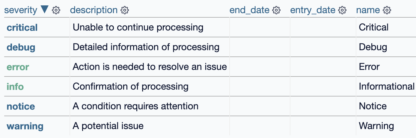 Severities are found in Datasette. ‘Errors’ are the most important ones for this piece of work, as they’re ‘external’ errors which means users must act on them to fix them.